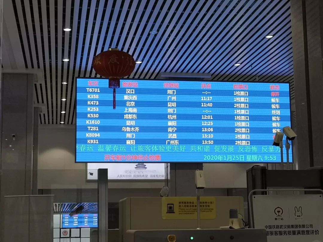 “为全力做好新型冠状病毒感染的肺炎疫情防控工作,按照国铁集团要求,荆门火车站出发通道将于2020年1月25日中午12点进行封闭……”距离封站还有一个多小时,荆门火车站候车厅在循环播放即将封站的广播。