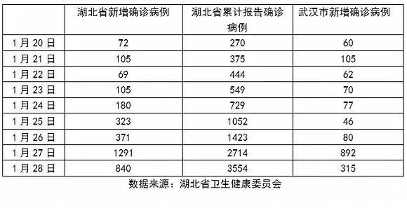 据湖北卫健委通报,1月28日0时-24时,湖北省新增新型冠状病毒感染的肺炎病例840例(武汉市新增315例、黄石市新增33例、十堰市新增23例、襄阳市新增61例、宜昌市新增12例、荆州市新增30例、荆门市新增28例、鄂州新增27例、孝感市新增101例、黄冈市新增111例、咸宁市新增21例、随州市新增46例、恩施州新增13例、仙桃市新增5例、天门市新增11例,潜江新增1例,神农架林区首发2例)。全省新增死亡25例,其中:武汉市19例,孝感市2例,荆门、鄂州、黄冈、天门各1例。