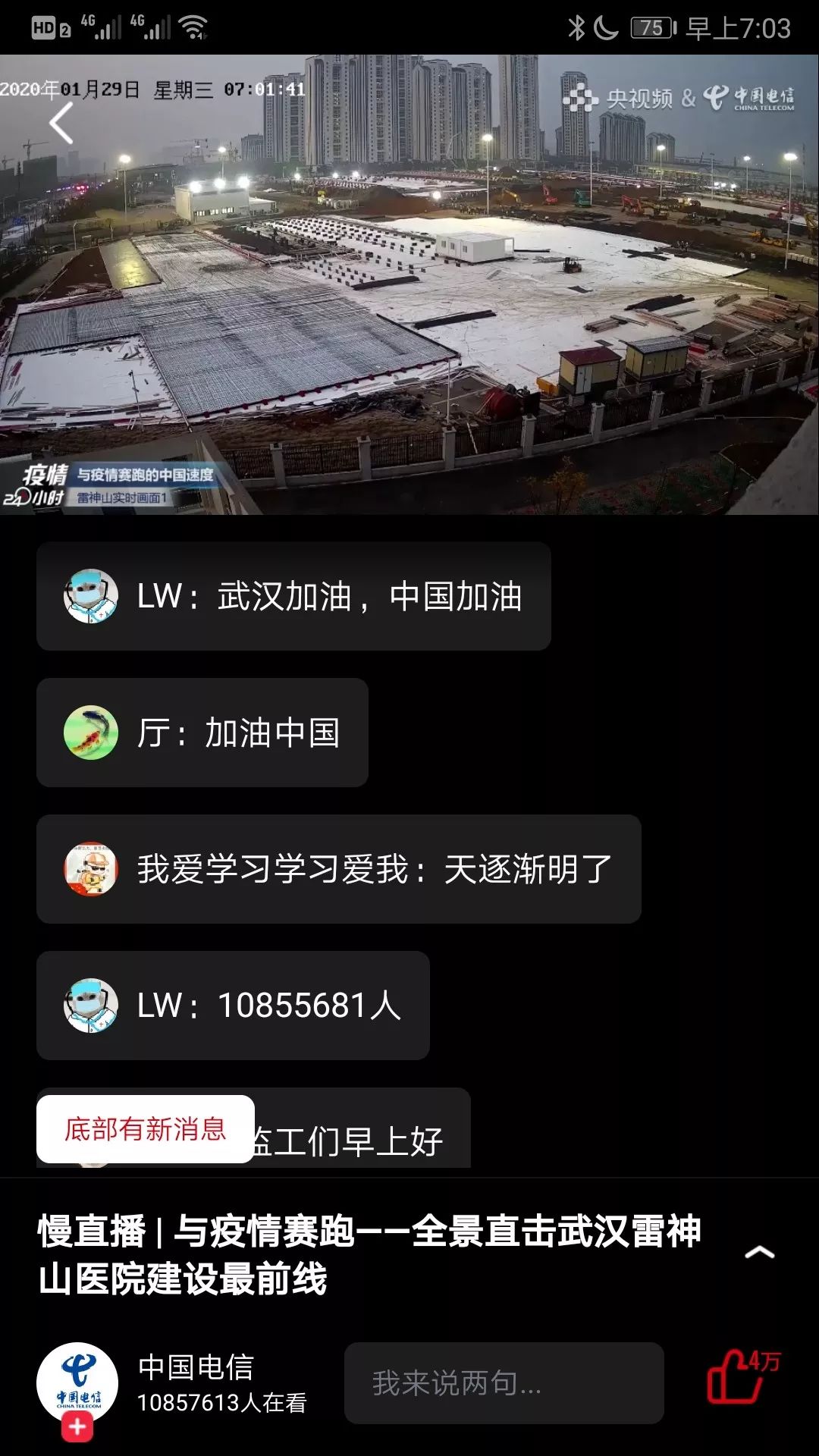 1月29日清晨7点整,在央视频APP的两个医院直播间中,陪伴着现场施工机器轰鸣声的在线观看网友,已经分别超过1000万人。