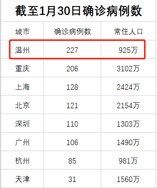 作为浙江省的地级市,截至1月30日,温州市新型肺炎确诊病例数,已经达到227例,成为湖北省之外,确诊数最多的城市,超过本省省会杭州,也超过一线城市北上广深,超过四大直辖市,还超过了大部分省份。