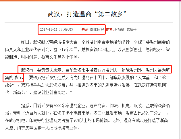 在湖北日报2017年11月题为《武汉:打造温商第二故乡》的文章中,武汉市主要负责人表示,目前武汉市生活着10多万温州人,是除温州外,温州人最为聚集的城市。
