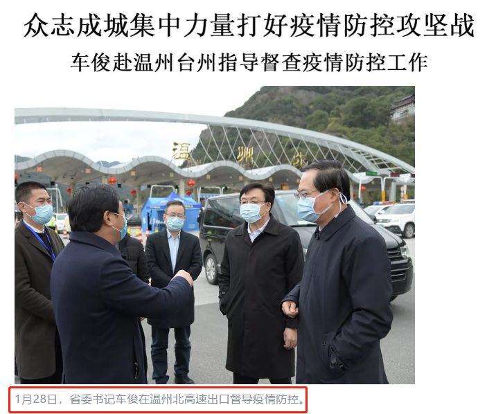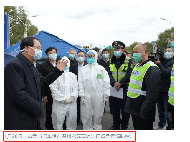 根据浙江发布,1月28日农历大年初四,温州、台州来了一位不速之客。浙江省委书记车俊深入医院、农村(社区)、企业、高速公路出入口等地,看望慰问奋战在疫情防控一线的工作人员,以明察与暗访相结合的方式,指导督查疫情防控工作,对做好这项当前全省最重要的政治任务进行再动员、再推动、再落实。