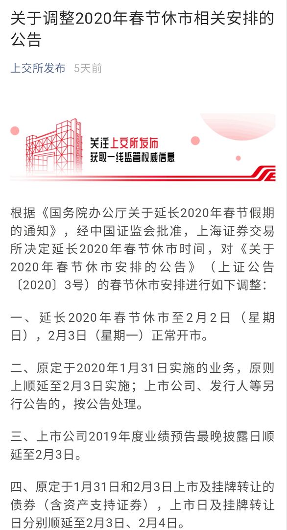 在新型冠状病毒引发的肺炎疫情席卷之下,资本市场同样面临着严峻挑战。1月27日晚间,沪深交易所、四大期货交易所、全国股转系统和中国结算均发布公告称,经证监会批准,决定延长2020年春节休市时间,延长2020年春节休市至2月2日(星期日),2月3日(星期一)正常开市。