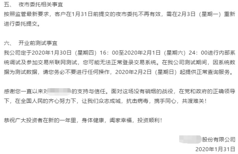 国泰君安证券则采用了公司公告、95521短信提醒、君弘app消息推送、客户经理电话沟通等四种方式对投资者进行告知。并同时告知客户,隔夜委托将于2月2日20:00开放,引导客户根据交易意愿决定是否重新下达隔夜委托。