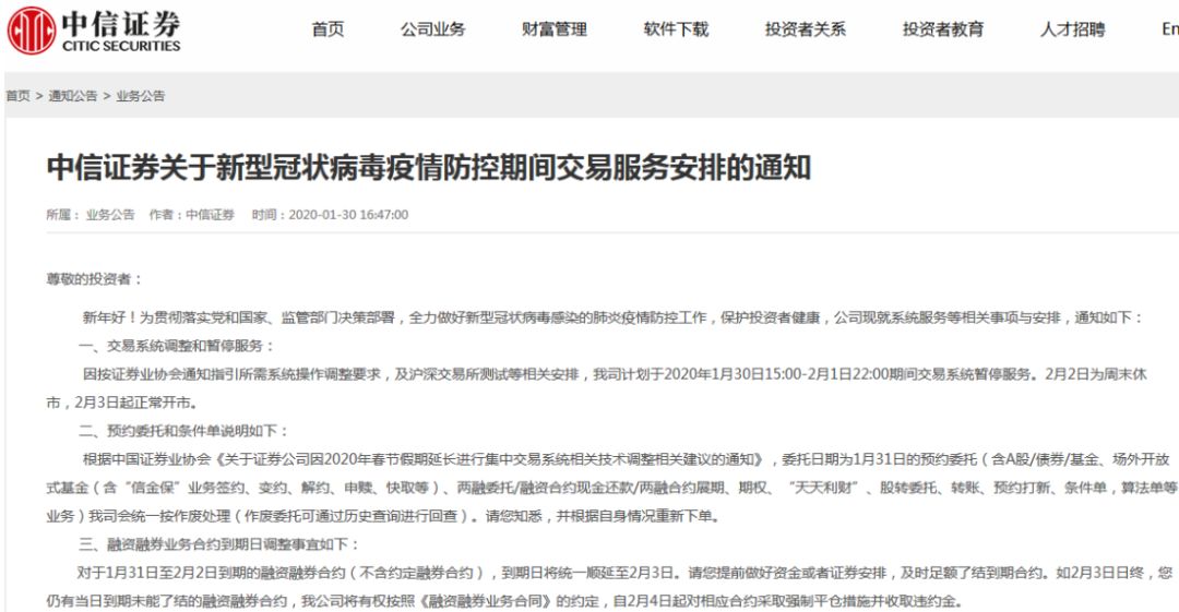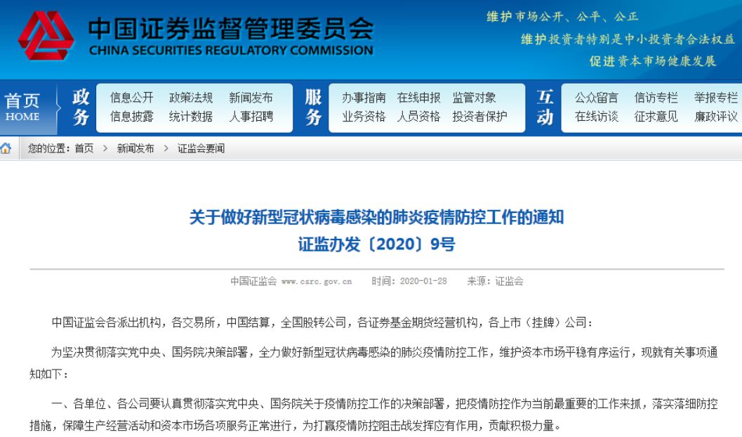 1月28日,证监会网站发布《关于做好新型冠状病毒感染的肺炎疫情防控工作的通知》,要求各证券基金期货经营机构结合行业特点,做到改进服务方式、维护业务稳定、引导理性投资、关心关爱员工。其中特意强调,引导投资者采取非现场方式进行交易活动,并为非现场交易提供有效的技术保障和相关服务,这也是对券商线上服务能力的考验和挑战。