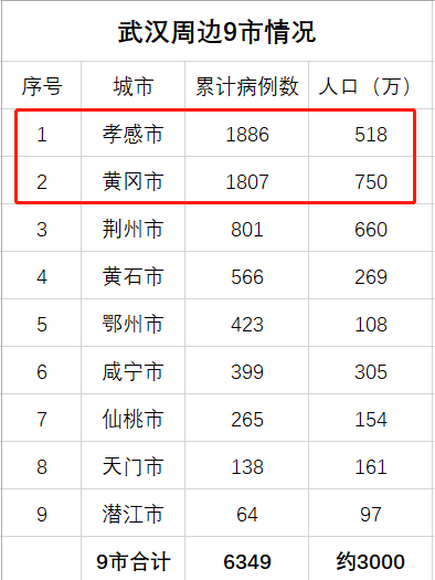 黄冈是湖北省除武汉之外人口最多的城市,也是打工人口最多的城市,与武汉一向往来密切;孝感的人口数量在湖北辖区内也位居前列。