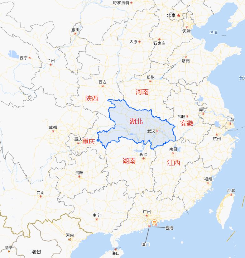 湖北省位于中华人民共和国的中部,简称鄂。地跨东经108°21′42″~116°07′50″、北纬29°01′53″~33°6′47″。东邻安徽,南界江西、湖南,西连重庆,西北与陕西接壤,北与河南毗邻。东西长约740公里,南北宽约470公里。全省土地总面积18.59万平方公里,占全国总面积的1.94%。
