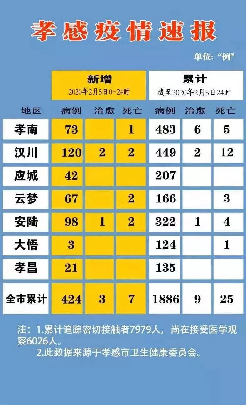 截至2月5日24时,孝感市新型冠状病毒感染的肺炎确诊病例新增424例,累计1886例。现有疑似病例158例,其中当日新增28例。