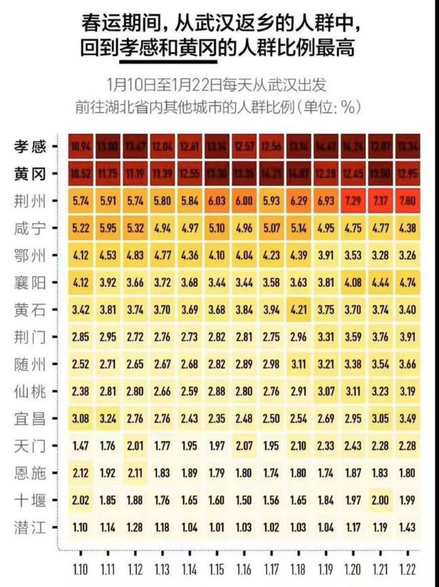 百度迁徙升级版统计数据显示,从1月10日-22日,黄冈和孝感是武汉流动人口出行的最主要目的地。离开武汉的人当中,平均每天有13.03%和12.64%是从武汉出城到达孝感和黄冈。也就是说,这两座城市每天都会接纳武汉市超过25%的出行人员。