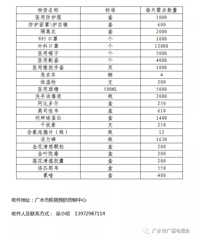 现在我们整个广水地区急需以下物资(每天需求量)