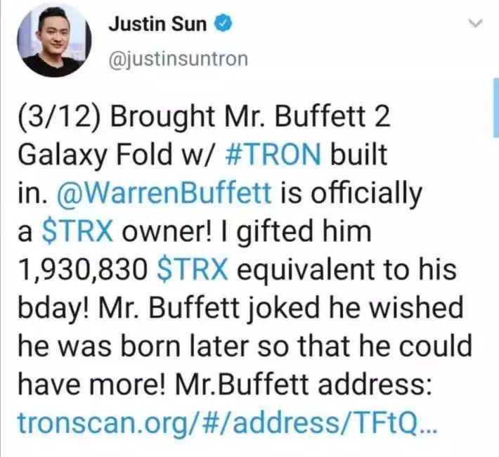 孙宇晨随后还表示,他在与巴菲特的餐会中向其赠予了一个内置1930830枚波场(数字代表巴菲特生日,巴菲特生于1930年8月30日)的三星Galaxy Fold手机,目前巴菲特已经成为了波场持有者。