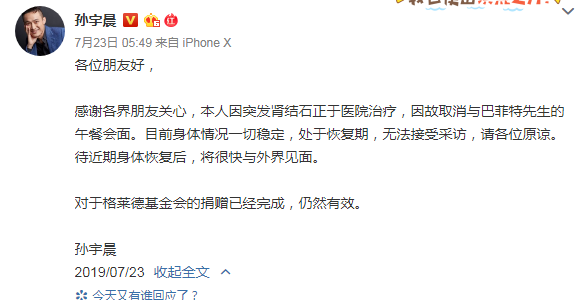 7月23日,孙宇晨因突发肾结石治疗,因故取消与巴菲特先生的午餐会面 。
