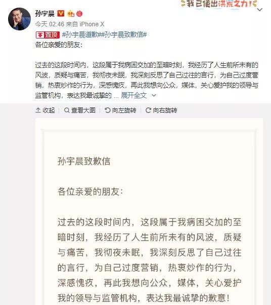 2019年7月25日凌晨,孙宇晨发微博称为自己过度营销,热衷炒作的行为深感愧疚,向公众,媒体,与监管机构等表达诚挚歉意。孙宇晨表示,由于自己言行不成熟,导致巴菲特午餐事件渐渐演化成一场失控失败的过度营销,产生了大量始料不及的后果,对公众造成了不好的影响,也引起了监管机构的担忧。对此,他表示“极为诚恳的歉意”。