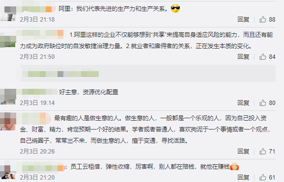 有的指出这是资源优化配置;也有的人为特殊时刻灵活应变,保障好员工和企业合理合法权益。