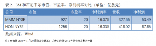 如今的霍尼韦尔和3M都是市值千亿美元的巨头,2018年霍尼韦尔的营收达到418.02亿美元,净利润达到67.65亿美元;体量稍大于3M公司,但是盈利能力上,霍尼韦尔和3M的表现相当,2018年两者的净利润率都在16%左右(表2)。