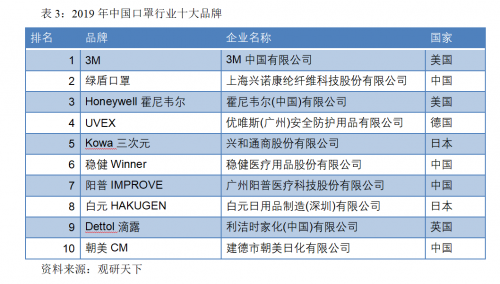 依托品牌和销量,2019年中国口罩十大品牌中,3M居于榜首(表3)。