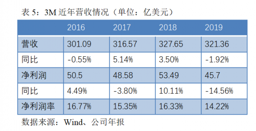 经历过一个世纪的“成长-多元化转型”,3M体量已经十分庞大,营收和净利润都处于缓慢小幅增长的状态(表5)。Wind显示,3M 过去4年的营收都在300亿美元之上,但2019年的营收增速已经从3.5%下降到了-1.92%。其整体盈利能力也十分强大,2019年净利润仍然达到了45.7亿美元,虽然已经同比下降了14.56%。
