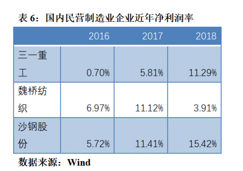 3M整体的盈利能力,仍然强于国内民企里的工业/制造业巨头。重工业中的三一重工(600031)和沙钢股份(002075)2018年的净利润率分别为11.29%、15.42%;但这两家企业的盈利能力并不稳定,波动较大。而中国最大的棉纺织生产商——魏桥纺织(02698.HK)的盈利能力稍逊一筹,净利润率从2017年的11%降到了2018年的3.9%(表6)。
