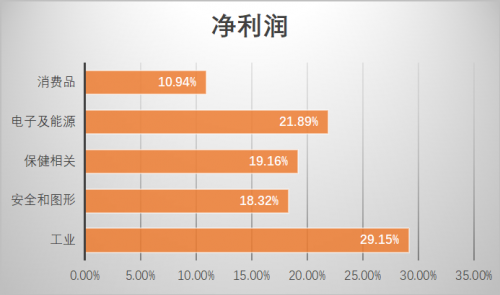 工业是3M 起家的产品线。2018年,工业依旧在其总净利润占比中最大,达 29.15%。电子及能源的利润占比仅次于工业,达到21.89%。安全和图形及医疗保健相关业务的利润分别占据18.32%和19.16%。消费品部门贡献的利润最少,不到11%(图2)。