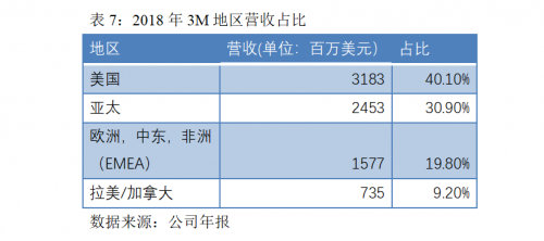 3M的2018年年报显示,口罩所在的消费品部门贡献的收入只有14%,也是就是不到1/5;而消费品的整体收入又是由美国、亚太、EMEA和拉美/加拿大4个大区组成,中国所在的亚太地区仅占30%(表7)。所以,假设中国占亚太的1/3,粗略估算3M中国的消费品收入占不到3M整体收入的2%(30.9%*1/3*14%=1.4%)。