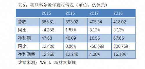 成功的工业巨头连瓶颈都是相似的。如今的霍尼韦尔市值已达1256亿美元,年营收体量超400亿美元,在多元化格局逐渐稳定的情况下,整体很难有大的波动。2015-2018年,霍尼韦尔营收从385亿美元增至418.02亿美元,4年间涨幅仅为8.34%,净利润则从47.68亿美元增至67.65亿美元,涨幅达到了41.88%(表8)。