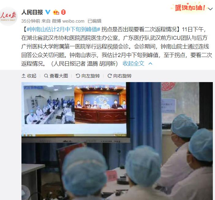 钟南山表示,目前来看,什么时候出现拐点还无法预测,但预计2月中下旬可能会出现峰值。