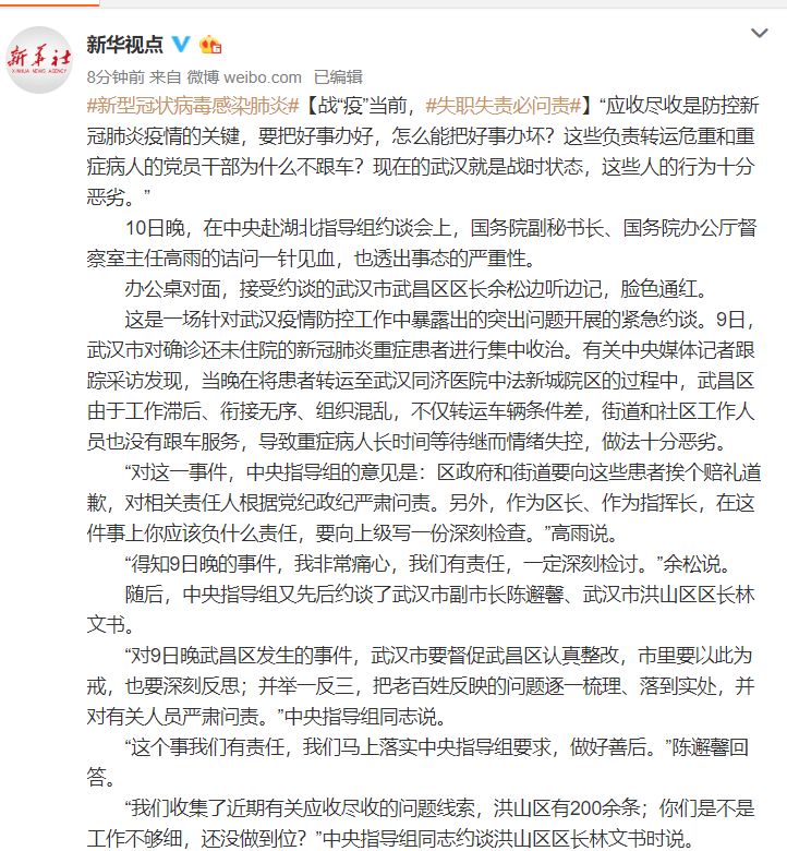 据新华社报道,10日晚,在中央赴湖北指导组约谈会上,国务院副秘书长、国务院办公厅督察室主任高雨就武汉疫情防控工作中暴露出的突出问题开展的紧急约谈。
