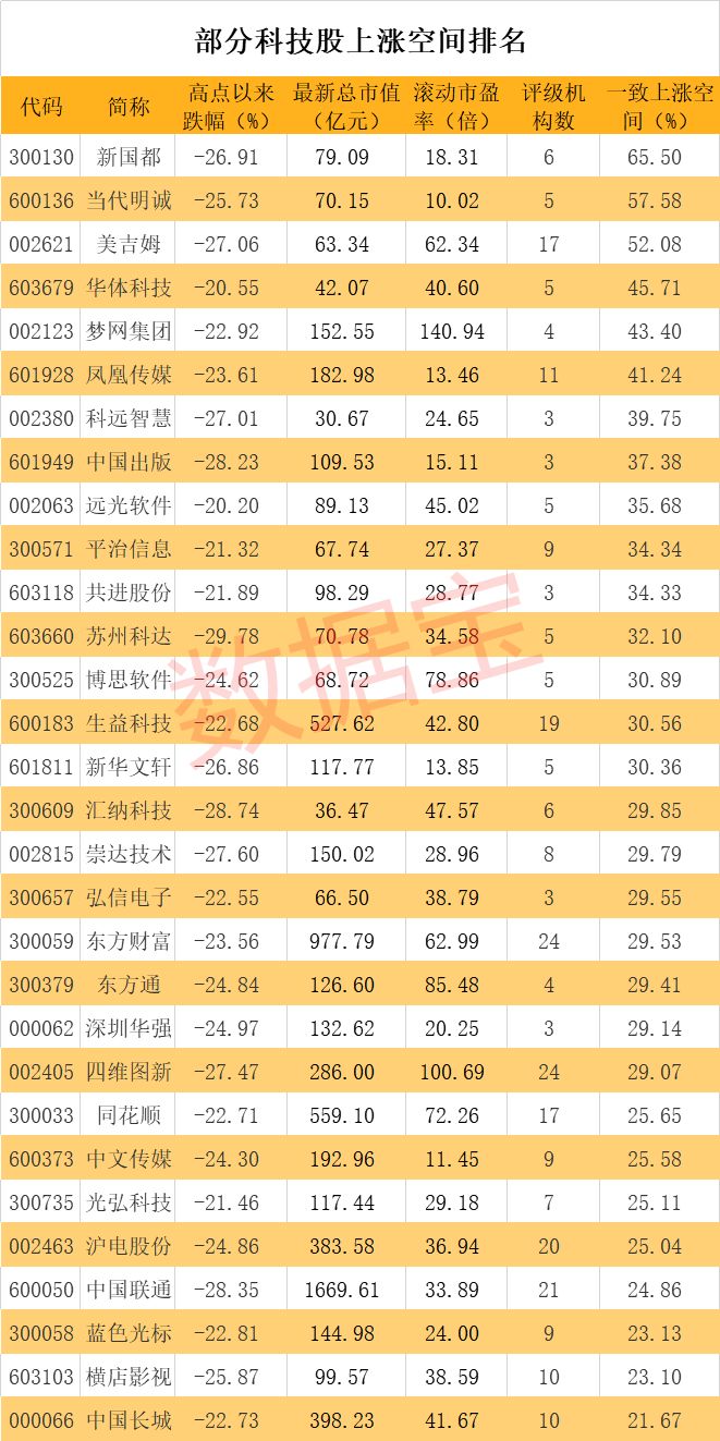 科技行业大周期牛市机会犹存,不妨参考一些仍在相对底部的科技龙头股。证券时报·数据宝统计显示,通信、计算机、电子、传媒四大行业股票中,最新价较去年初以来高点下跌超过20%、近半年以来有3家以上机构评级且一致目标价上涨空间超过20%的股票,合计有31只。