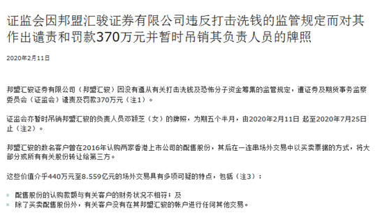 据香港证监会网站2月11日披露,本地券商邦盟汇骏因违反打击洗钱的监管规定,遭证监会谴责及罚款370万港元。同时,暂时吊销邦盟汇骏负责人员邓颖芝(女)的牌照,为期五个半月,由2020年2月11日起至2020年7月25日止。