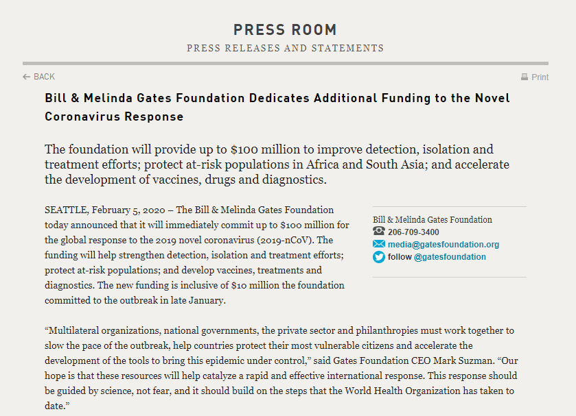 在此信发布之前,盖茨基金会承诺投入最高1亿美元,用于支持世界卫生组织、中国相关机构以及其他国际和国家层面的相关机构共同应对疫情。这笔资金将用于加强病例发现、隔离和治疗,保护弱势人群,以及加速开发疫苗、药物和诊断方法。在此之前,WHO宣布国际社会已启动了一项6.75亿美元的战略准备和响应计划(SPRP),提出在未来三个月中国际卫生组织应当实施的公共卫生优先举措。