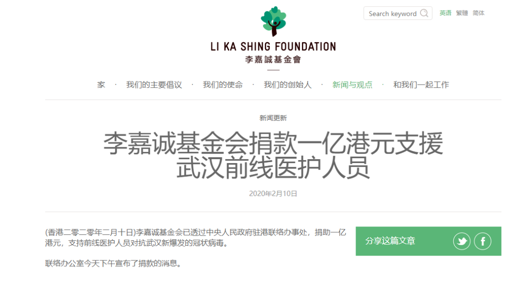 李嘉诚基金会已通过中央人民政府驻港联络办事处,捐助一亿港元,支持前线医护人员对抗武汉新爆发的冠状病毒。