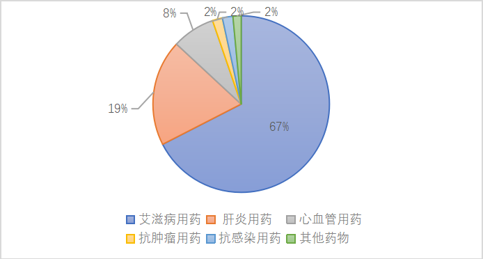 不过,因为丙肝特效药治愈效果太好,该药的销量在持续下降。目前,吉利德核心板块是艾滋病用药和肝炎用药;其中超过6成的收入皆来自艾滋病用药。2018年年报显示,吉利德的艾滋病用药的收入为149亿美元,占比达到67.47%;肝炎用药收入为49.9亿美元,占比为19.43%;心脑血管、抗肿瘤用药以及抗感染药,三者的合计占比还不到12%(图1)。
