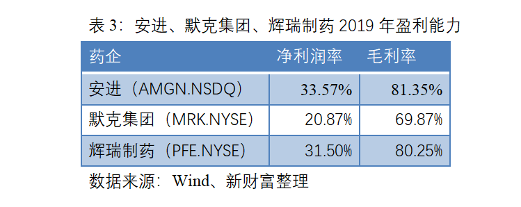 不过,由于丙肝药物的销量持续下滑,吉利德近年的净利润率和毛利率均出现下滑,距离2016年毛利率高达85%的顶峰,2019年已经跌回80%左右,稍逊于安进和辉瑞(表3)。