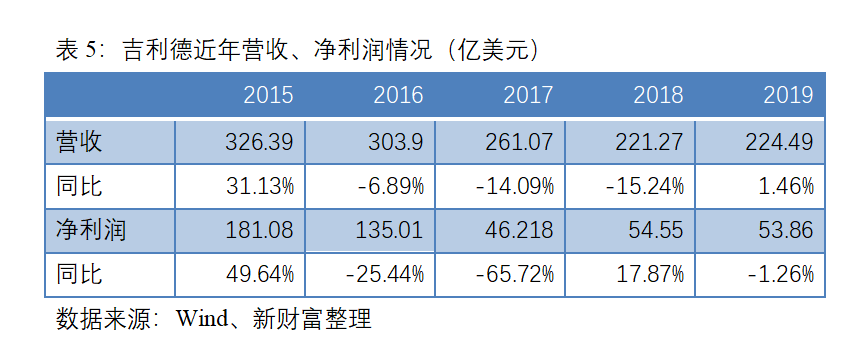 营收、净利双双下降,是其市值腰斩的主要元凶。年报显示,2015年吉利德的业绩达到高点,当年营收达到326.39亿美元,净利润达到181.08亿美元。此后一路直线下跌,2019年其营收已经下降到224亿美元,不到2015年的7成;而净利润更下跌到了53.86亿美元,不及2015年净利润的1/3(表5)。