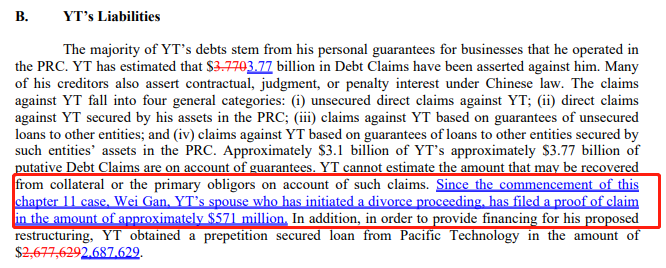 加上妻子这5.71美元的离婚索偿,贾跃亭还有约31亿美元因为担保而产生的债务索偿,至此,贾跃亭欠债共37.7亿美元(约合人民币260亿元)。
