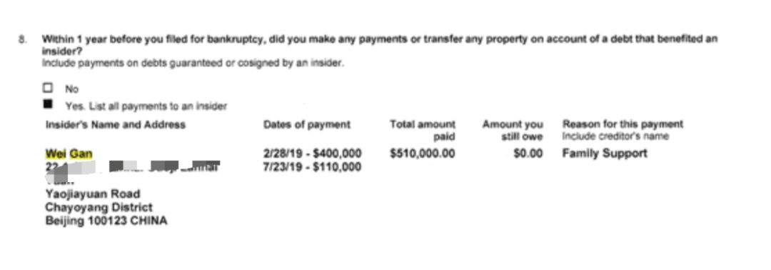 该份文件同时显示,贾跃亭在提交破产申请前的一年之内,曾于今年2月28日和7月23日分别向甘薇转账40万美元和11万美元,总计51万美元(约360万人民币),在用途一栏标注的是“家庭费用”。