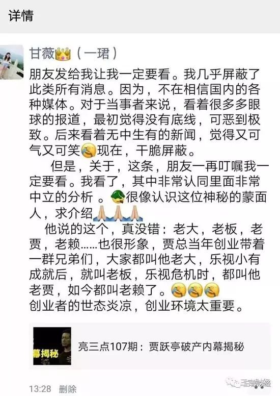 此前,甘薇朋友圈发文谈贾跃亭破产一事:从“老大”到“老赖”是创业者的世态炎凉。