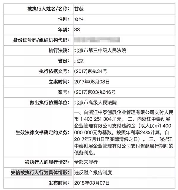 2018年4月,从中国执行信息公开网上看到,因与中泰创展的纠纷,案号(2017)京03执646号,贾跃亭、甘薇、乐视控股被列为了失信被执行人。