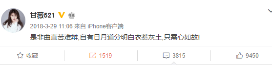 随即甘薇在微博发文称,“是非曲直苦难辩,自有日月道分明。白衣惹灰土,只需心如故!”被媒体形容“喊冤”。