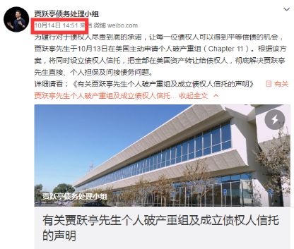 去年10月14日,贾跃亭债务处理小组在发布的《有关贾跃亭先生个人破产重组及成立债权人信托的声明》(以下简称声明)中表示,贾跃亭已于美国当地时间10月13日根据美国相关法律第11章主动申请个人破产重组。