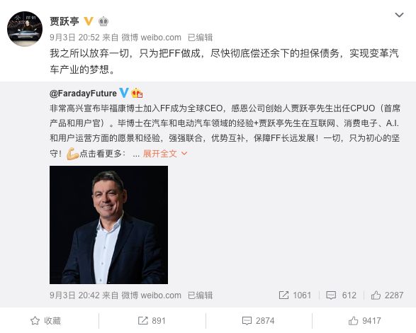 去年9月,贾跃亭辞去FF全球CEO一职,并在微博上表示:“我之所以放弃一切,只为把FF做成,尽快彻底偿还余下的担保债务,实现变革汽车产业的梦想。”