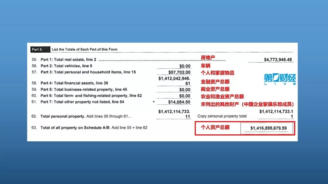 根据贾跃亭提交的破产申请文件,目前其个人资产总额为14.17亿美元(约合人民币近100亿元),逾99%是金融资产,还有不动产以及一些私人物品,未冻结存款总额约合人民币77.8万元。