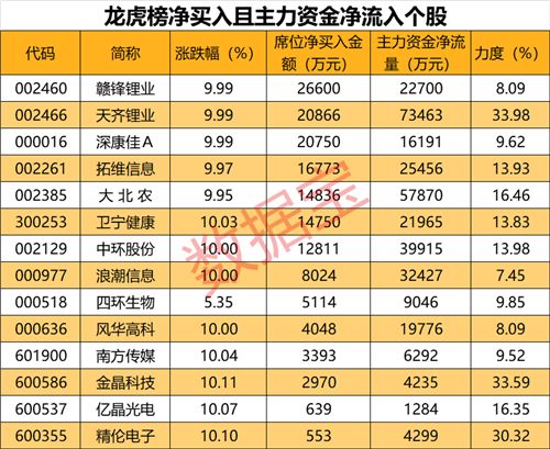 从盘口资金流向来看,主力资金净流入超五千万且龙虎榜净买入个股共有11只,其中天齐锂业、大北农、中环股份等个股资金净流入金额最大。净流入力度最大的个股有天齐锂业、金晶科技、精伦电子,净流入力度分别为33.98%、33.59%、30.32%。
