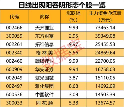 178股出现阳吞阴形态,天齐锂业等资金流入多
