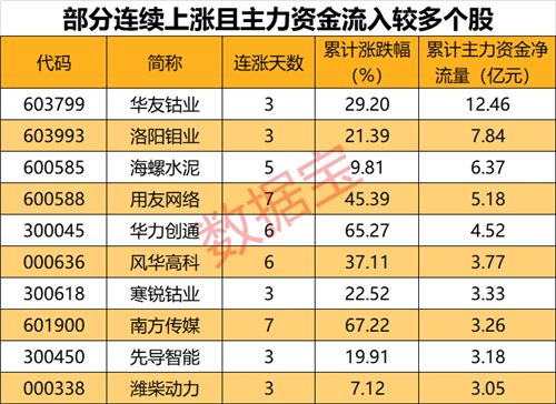 值得注意的是,762只连续上涨个股中,34只个股期间主力资金累计净流入超过亿元。其中,累计资金流入最多的为华友钴业,主力资金累计流入12.47亿元。
