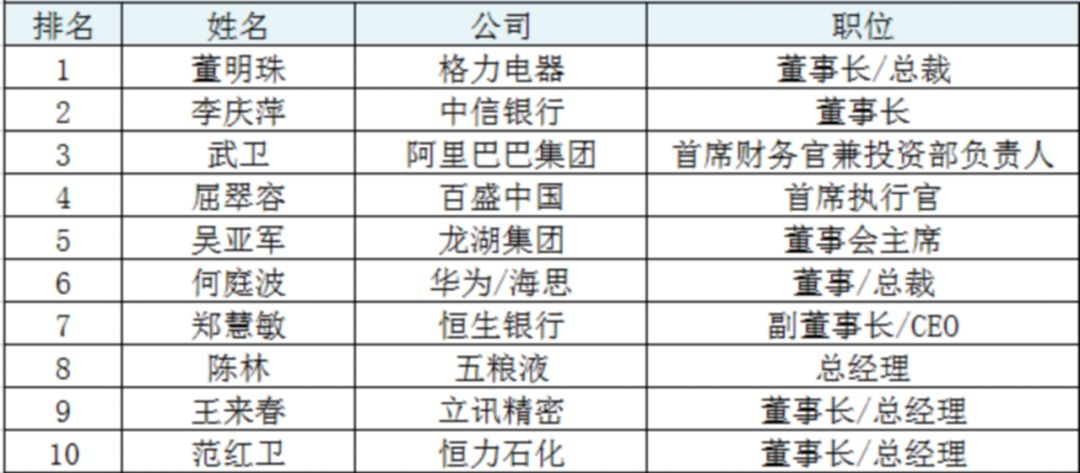 此次登上榜单的前十位的杰出女性分别是,格力电器董事长董明珠、中信银行董事长李庆萍、阿里巴巴集团首席财务官兼投资部负责人武卫、百盛中国首席执行官屈翠容、龙湖集团董事会主席吴亚军、海思总裁何庭波、恒生银行副董事长郑慧敏、五粮液总经理陈林、立讯精密董事长王来春,以及恒力石化董事长范红卫。