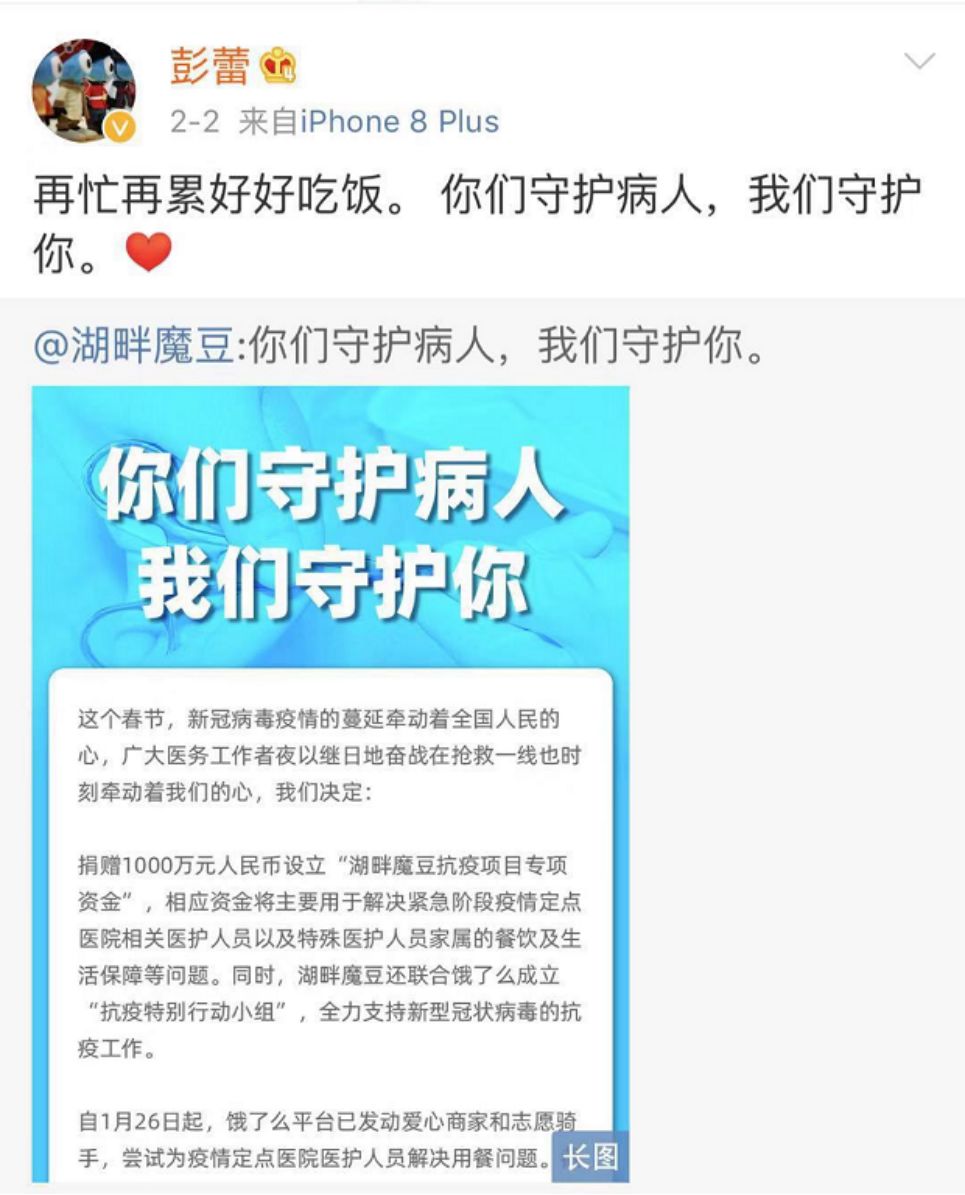 2017年,以彭蕾、武卫、童文红、蒋芳、郑俊芳等为代表的阿里12位合伙人成立了公益基金会——湖畔魔豆公益基金会,此次共为疫情捐赠1000万元,并设立“湖畔魔豆抗疫项目专项资金”,主要保障医护人员以及医护人员家属的餐饮及生活问题。