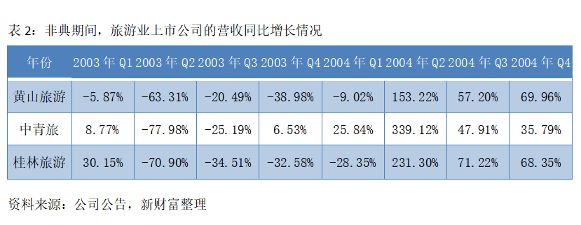 在受疫情影响最严重的2003年二季度,黄山旅游(600054)、中青旅(600138)、桂林旅游(000978)等企业的营收增速大幅下滑,由此对全年营收影响在30%至40%左右(表2)。黄山旅游曾在2003年半年报中称:“仅以今年‘五一’黄金周为例,公司共接待境内外游客2211人次,比上年同期减少92560人次,下降幅度达97.7%。”中青旅也表示,非典爆发的5、6月份,业务基本处于停滞状态。