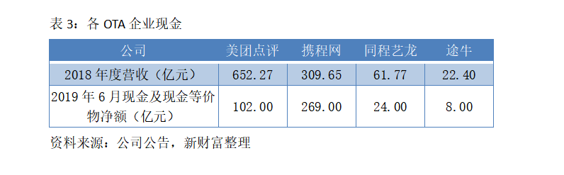 从财务状况看,此次疫情对头部OTA企业虽不致命,但对途牛(TOUR.O)等第二梯队企业而言则是个考验。截至2019年年中,携程、美团点评(03690.HK)等企业账上依然有过百亿元的现金及现金等价物,现金流并不吃紧(表3),但疫情依然会影响其业绩。