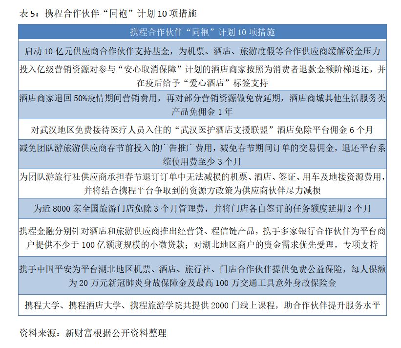 为了安抚供应商情绪,1月26日至27日间,携程、途牛、同程艺龙(00780.HK)等OTA平台先是将重大灾害保障金提升至2亿元。2月5日,途牛宣布减免门店管理费6个月,签约任务额考核延期3个月。携程网则推出“同袍”计划,包括启动10亿元支持基金为合作供应商缓解资金周转压力等10项措施(表5)。极数大数据平台显示,2019年上半年,我国在线旅游交易额超过7000亿元,携程占55.7%,超过其他所有平台之和;飞猪位居第二,近20%。